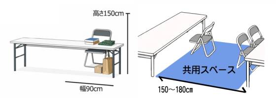 出展者の座る椅子の共用スペースは、幅150~180cm程の奥行予定であり、人が居るのに十分な共用スペースとなります。